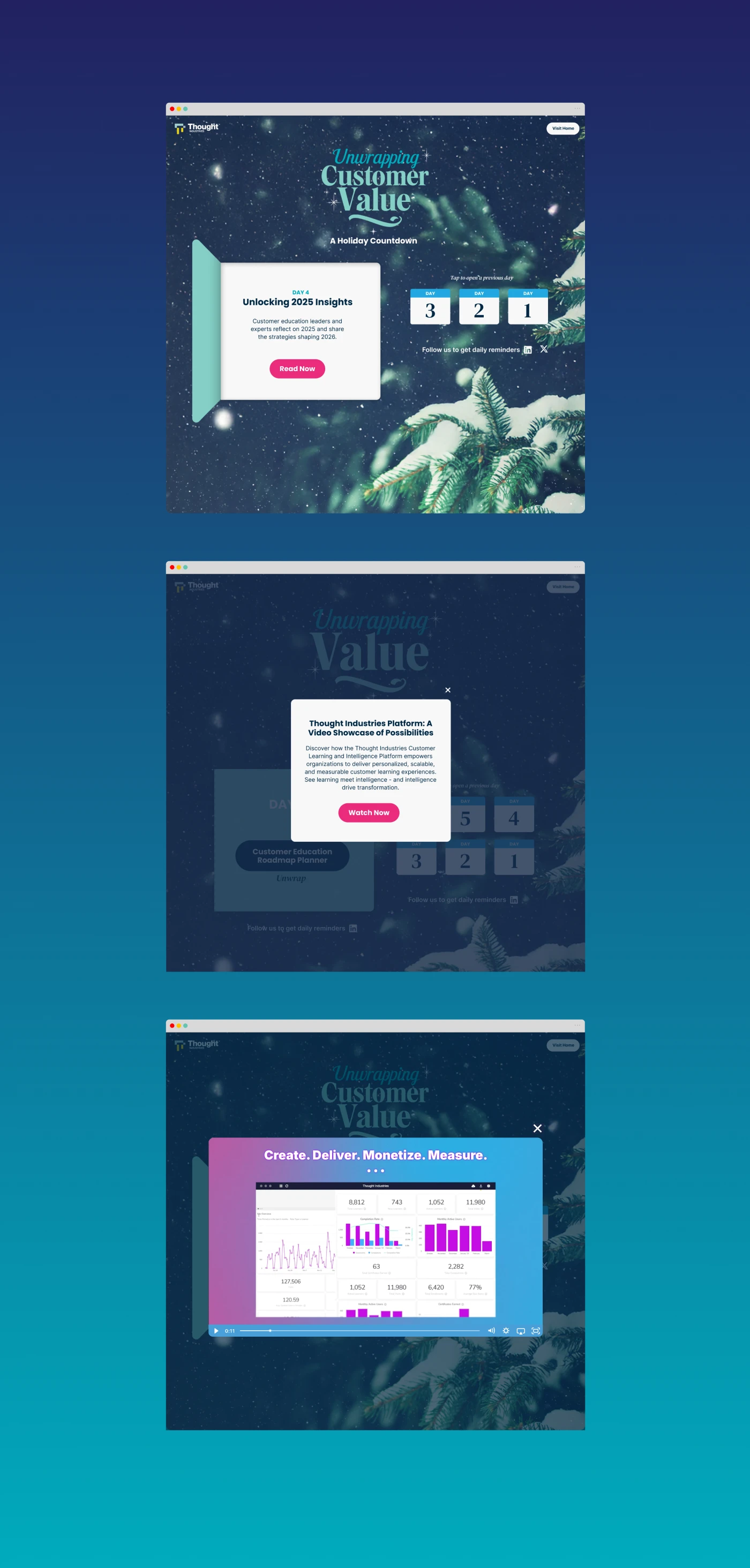 Thought Industries asked us to create a campaign microsite that delivered a new “gift” to customers on each of the twelve days before Christmas. We built a custom platform integrating WordPress and HubSpot, enabling the team to schedule and release daily content—videos, PDFs, event tickets, and more. We also designed Canva-ready social templates to support consistent promotion throughout the campaign.